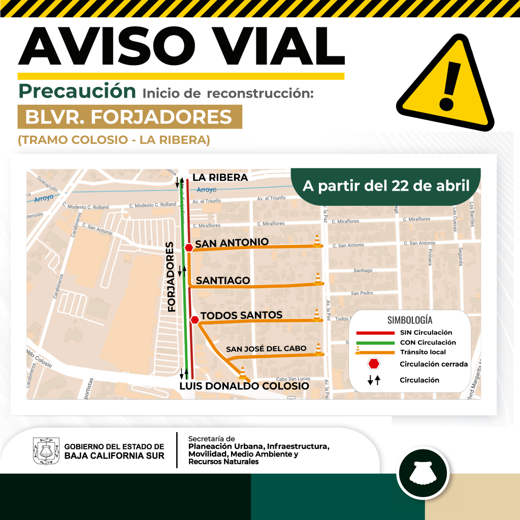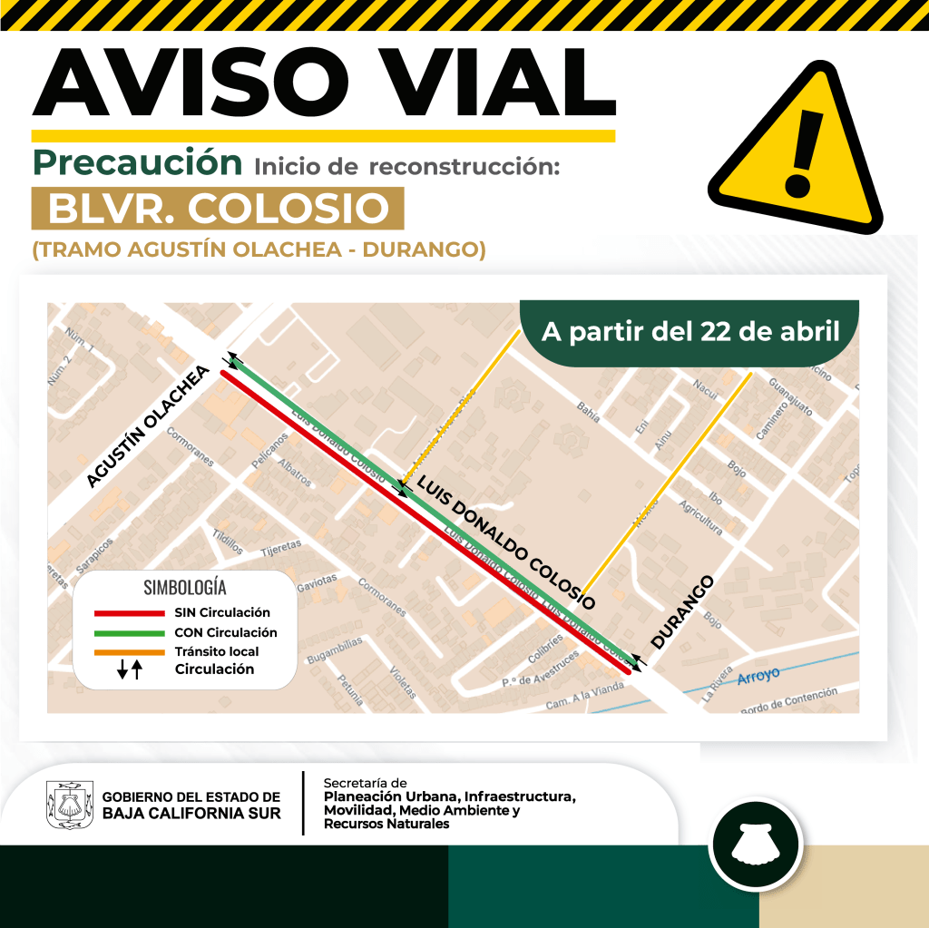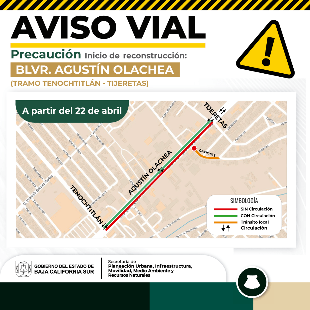 El Gobierno del Estado de Baja California Sur, a través de la Secretaría de Planeación Urbana, Infraestructura, Movilidad, Medio Ambiente y Recursos Naturales (SEPUIMM), informa a la ciudadanía que, a partir del lunes 22 de abril, se iniciarán las siguientes reconstrucciones completas en concreto hidráulico:
