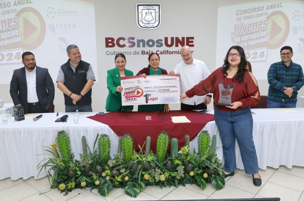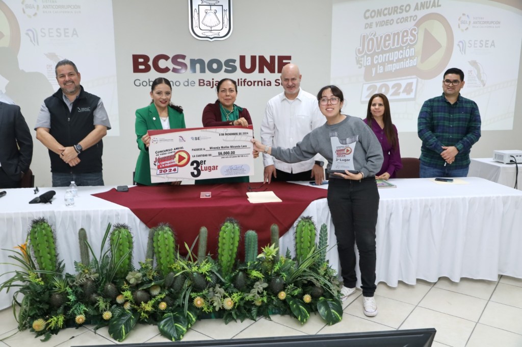 La Paz, BCS, 9 de diciembre de 2024 – En el marco del Día Internacional del Combate a la Corrupción, el Comité Coordinador (CC) del Sistema Estatal Anticorrupción (SEA) premió a los ganadores del Concurso Anual de Video Corto Jóvenes VS la corrupción y la impunidad 2024. El concurso, dirigido a estudiantes de nivel medio superior y superior de Baja California Sur, buscaba fomentar la participación ciudadana y la creatividad en temas de transparencia, ética y responsabilidad.