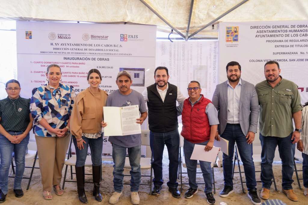 Entrega de Viviendas y Títulos de Propiedad en San José del Cabo: En la colonia Vista Hermosa, en San José del Cabo, se entregaron 84 unidades de cuarto dormitorio y cuarto para baño, 18 unidades de cuarto dormitorio y cuarto para baño incluyente, y 62 unidades de techo firme de concreto armado. Esta entrega, que requirió una inversión de $37 millones 258 mil 066.33 pesos, asegura que estas familias tengan acceso a viviendas dignas y seguras. Además, se entregaron títulos de propiedad, lo que garantiza certeza jurídica sobre su patrimonio.