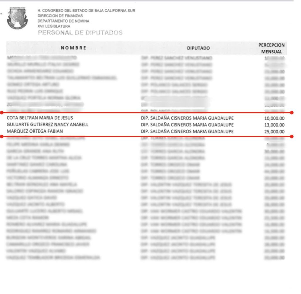 La Paz, Baja California Sur.- Una investigación periodística del portal noticioso www.la-arenga.com ha destapado una trama de corrupción y abuso de poder que involucra a la diputada local plurinominal por el Partido Acción Nacional, Guadalupe Saldaña Cisneros. La legisladora ha sido señalada por malversar fondos públicos al dar de alta en la nómina del Congreso del Estado a personas que no realizan ninguna labor, pero que reciben salarios que suman una escandalosa cantidad de 170 mil pesos al mes, lo podría alcanzar al termino de este año 2025 la desorbitante suma de casi los 2 millones y medio de pesos.
