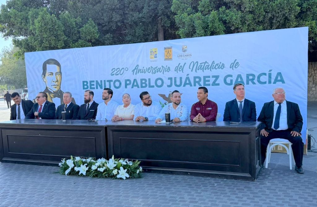 El XV Ayuntamiento de Los Cabos, que preside Christian Agúndez Gómez, a través de la Dirección Municipal de Educación, y en coordinación con la Nonagenaria Perseverante Respetable Logia Simbólica Faro del Sur No.9, conmemoró este sábado 21 de marzo el 220° aniversario del natalicio de Benito Juárez García, ceremonia en la que se conminó a que el recuerdo del Benemérito de las Américas siga siendo ejemplo de bienestar e igualdad social.